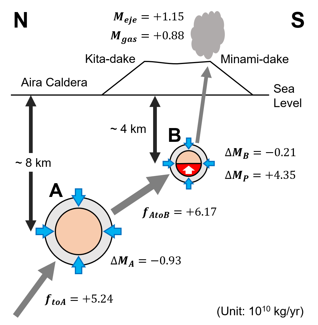 これは新鮮なマグマが脱ガス・高密度化し、この脱ガスマグマが桜島直下に蓄積していることを反映しています。